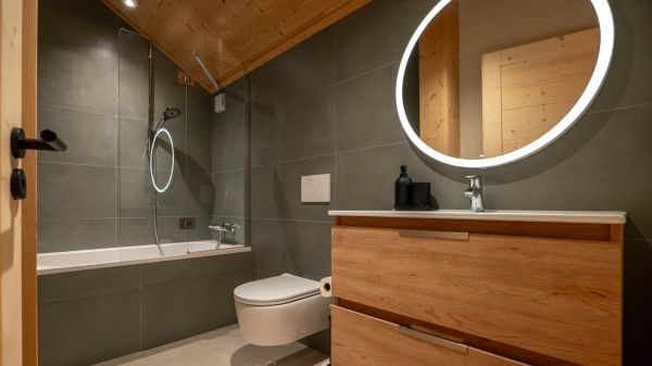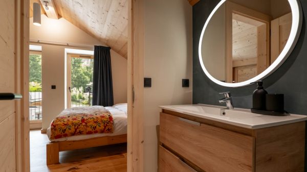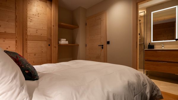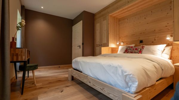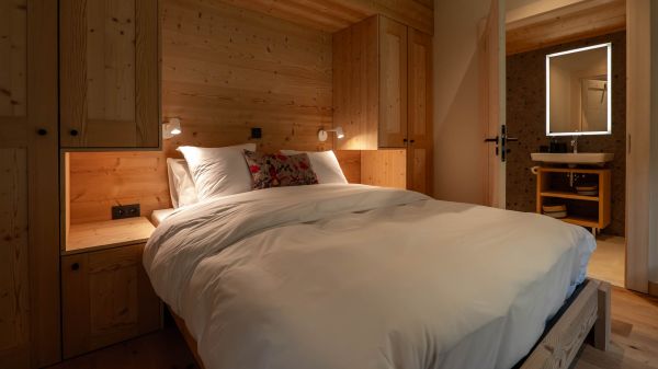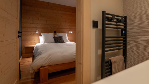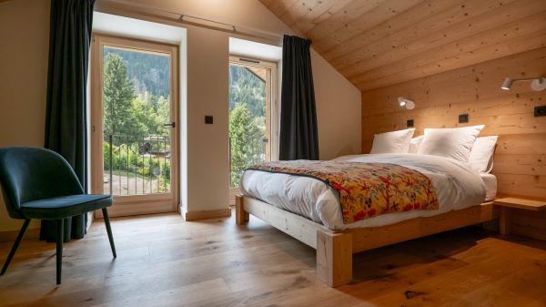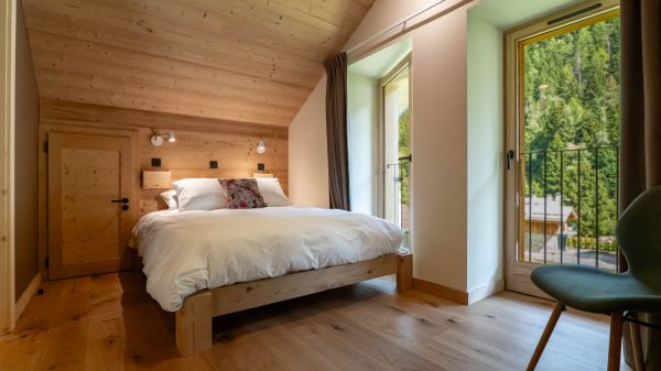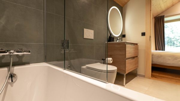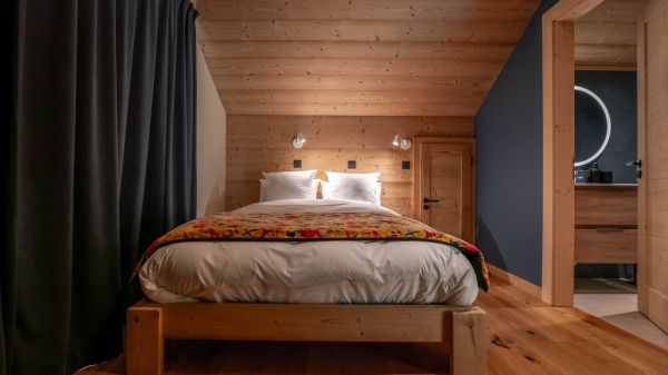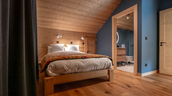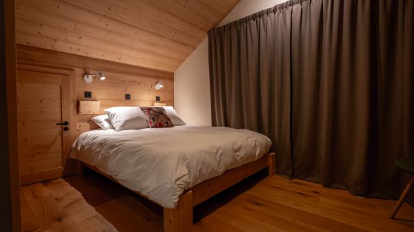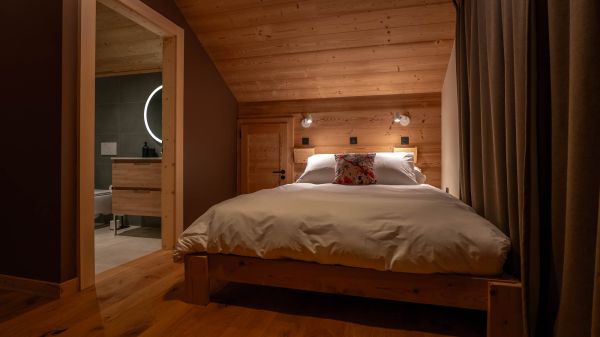 Upstairs, under the eaves, the omnipresent wood gives this room the feel of a cabin… a luxurious one! The bathroom even has a bathtub! Through the two large glass doors, the forest is your neighbour.