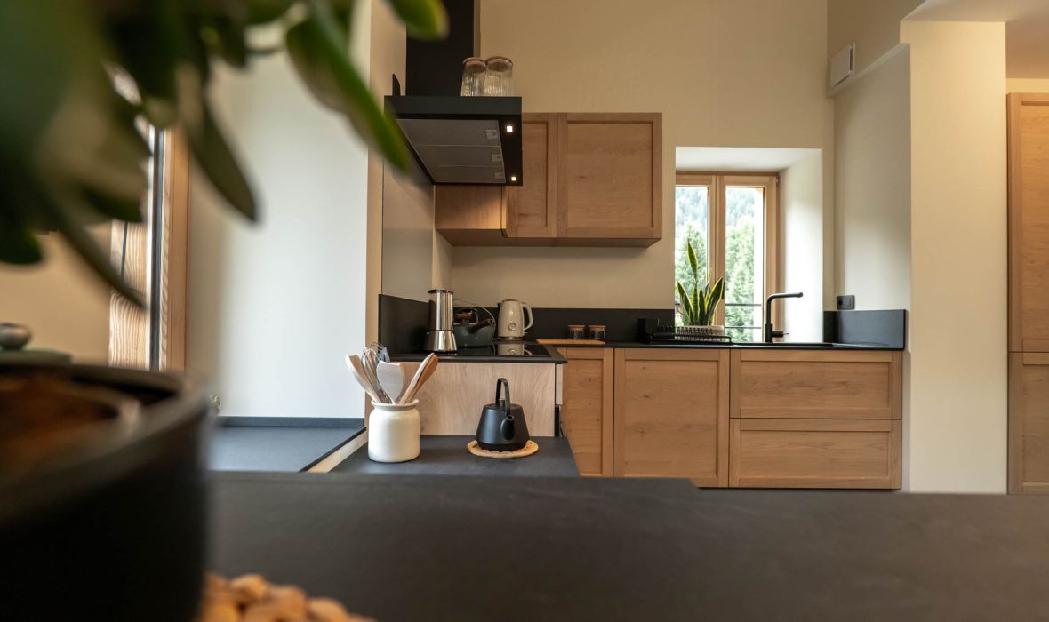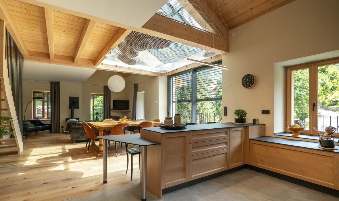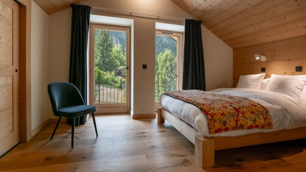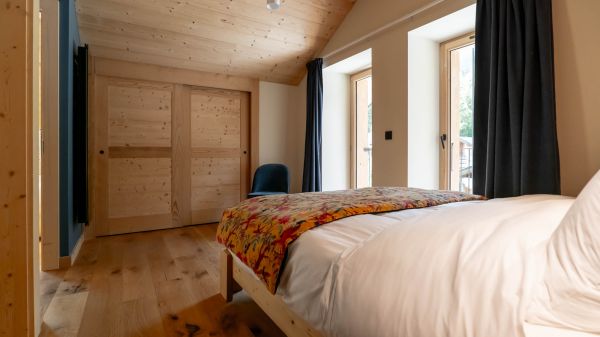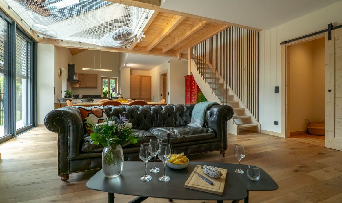 The large, cosy central room brings everyone together, but also allows everyone to relax on the sofa, read a book in the hammock, have a coffee at the bar or on the balcony, or cook while listening to the birds singing in front of the Mont Blanc mountain range, which is so beautiful from the hamlet of Lavancher.